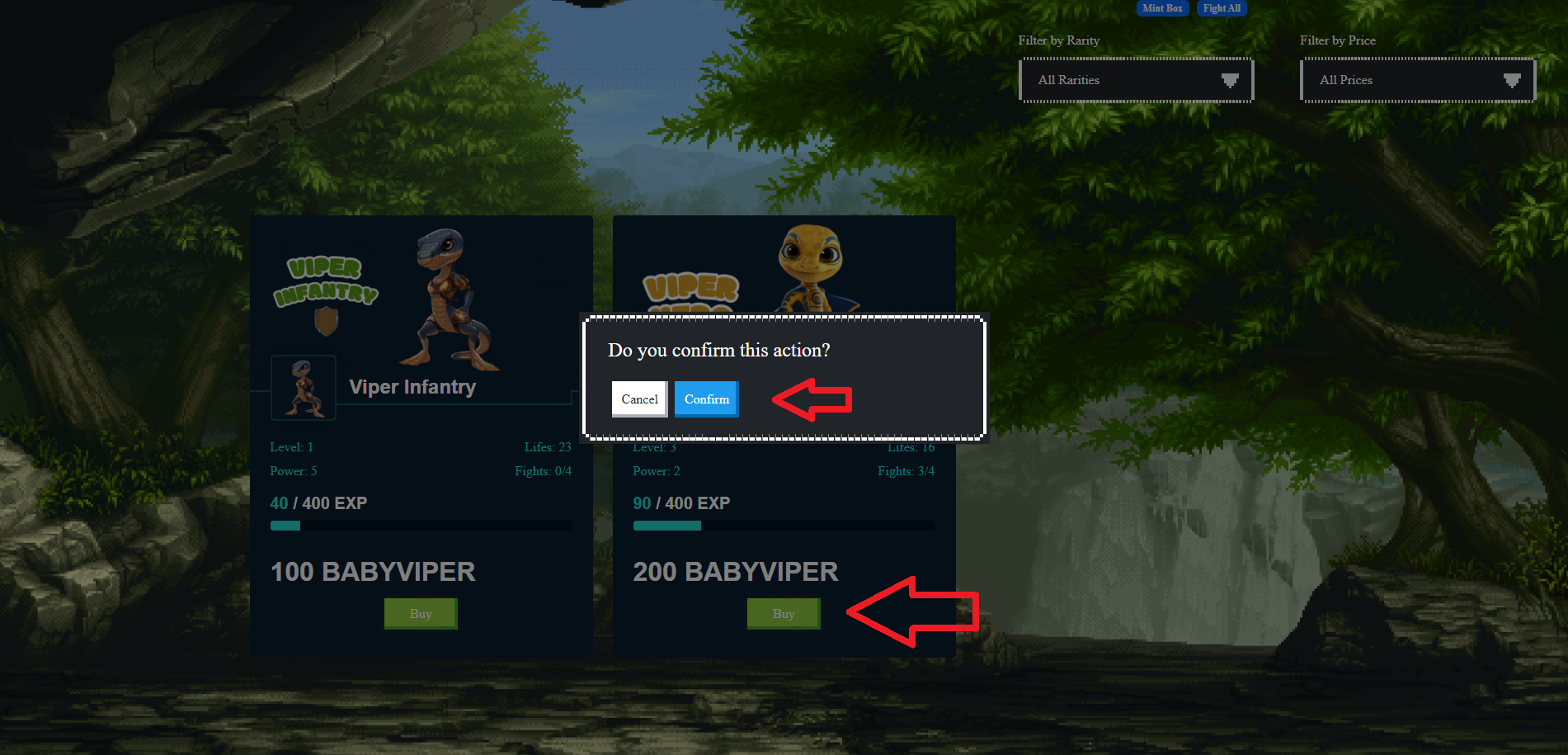 You also have the option to buy more evolved characters, and with greater rarities in the MarketPlace, just click on the buy button and confirm the transaction. The Character will be sent to you, and the funds to the seller.